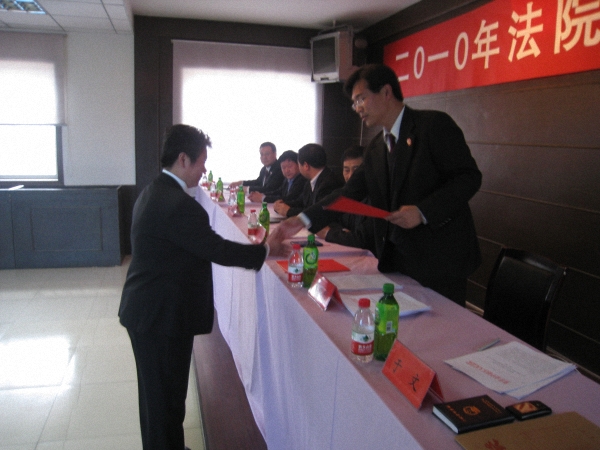 随后,中站区法院党组书记、院长朱战利作了题为“强化四个意识,推动法院工作科学发展”的重要讲话,全面回顾了2009年的各项工作并进行总结,同时也对2010年工作做了全面部署。他指出,2009年是中站区法院各项工作取得新的进展的一年, 被省高院评为“全省优秀法院”,在全市法院绩效考核中进入了前五名,信访工作被焦作市委政法委评为“全市集中处理涉法涉诉信访问题工作先进集体”,共取得了33项集体荣誉称号。他要求全院干警要清醒地认识到存在的困难和问题,切实增强责任感和压力感,坚定信心、振奋精神、开拓进取,重点抓好四项工作,推动全院各项工作再上新台阶:一是进一步强化大局意识,切实搞好审判执行工作。要从大局出发,认真谋划好法院各项工作,充分发挥审判职能作用,全力维护社会治安稳定,全力强化民事行政审判,全力加大执行工作力度,全力推进平安建设工作。二是进一步强化为民意识,不断完善为民便民各项措施。要把实现人民群众的新要求、新期待作为法院工作的根本出发点和衡量标准,始终坚持人民法官为人民,加强调解工作,妥善化解矛盾,完善信访措施,解决信访案件,以认真落实2010年向社会公开承诺的十件实事为抓手,进一步加强便民服务各项措施。三是进一步强化创新意识,不断加强法院自身建设。通过深入开展制度创新年和审判管理年活动,搞好法院制度建设;通过推进司法公开和司法民主,接受各界监督;通过在全院组织开展“一庭、一文、一课、一评”的“四个一”学习活动,不断提高干警的政治业务素质和司法水平,加强队伍建设,锻造一只高素质的法官队伍。四是进一步强化廉政意识,努力提高拒腐防变能力。通过认真开展党性、党风、党纪教育活动,严格落实党风廉政建设责任制,认真落实 “五个严禁”和“十条禁令”,建立健全案件及时揭露、及时发现、及时查处机制,把深化人民法院廉政建设作为一项事关法院生死存亡的重大政治任务,切实抓紧抓好。