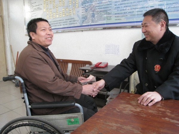 春节临近,为了使贫困当事人过一个平安年、祥和年,焦作市中站区人民法院加大了对涉及弱势群体案件的执行力度,利用节前黄金时期,加班加点,多措并举,及时维护申请人的合法权益。图为该院执行干警于腊月廿八向一位残疾申请人发放执行款。
