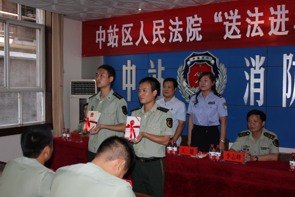 该院主管民事副院长及政治处主任向官兵们赠送法律书籍。