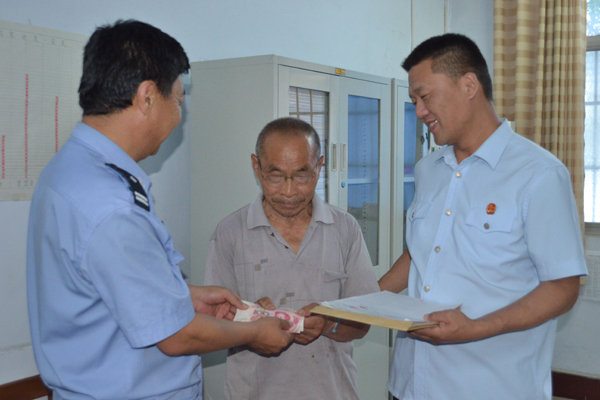 图为2014年6月26日我院执行干警仅用一天时间即执结一起赡养案,将500余元执行费送到75岁的申请人张某手中的情景。