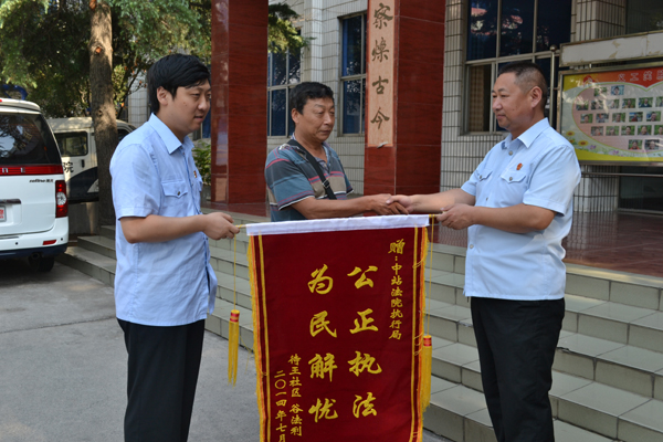 图为中站法院快速执结一起市中院交流指定案件后当事人向该院执行干警送锦旗以表谢意的情景。